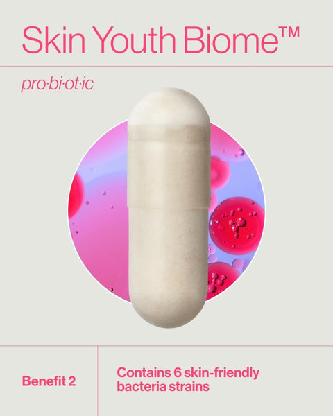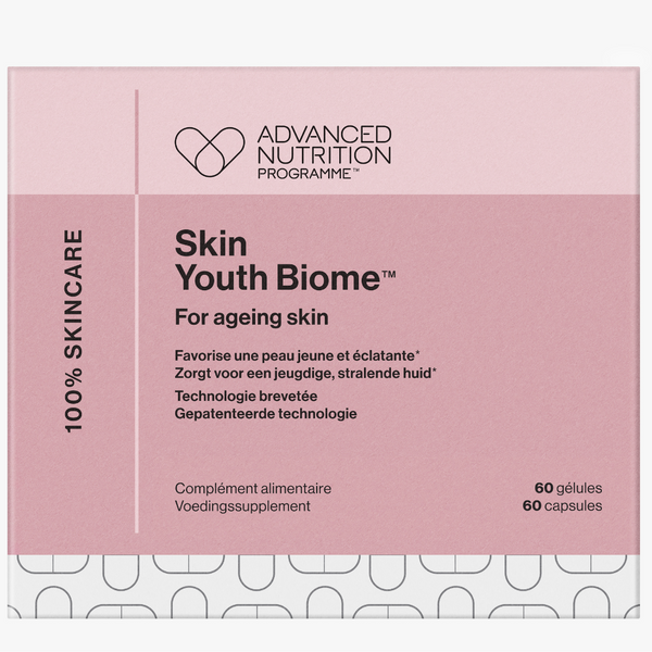 Skin Youth Biome™ bestaat uit 4 wetenschappelijk bestudeerde bacteriestammen, die uniek zijn voor Advanced Nutrition Programme™. Deze combinatie van levende culturen en vitamine C zorgt er niet alleen voor dat de darmflora gezond blijft en ondersteund wordt, maar ook dat de huid er gladder en jeugdiger blijft uitzien.